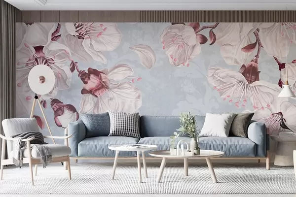 Fotomurales Estampado floral con grandes flores de cerezo rosas y blancas sobre un fondo de textura azul claro Nr. w08601