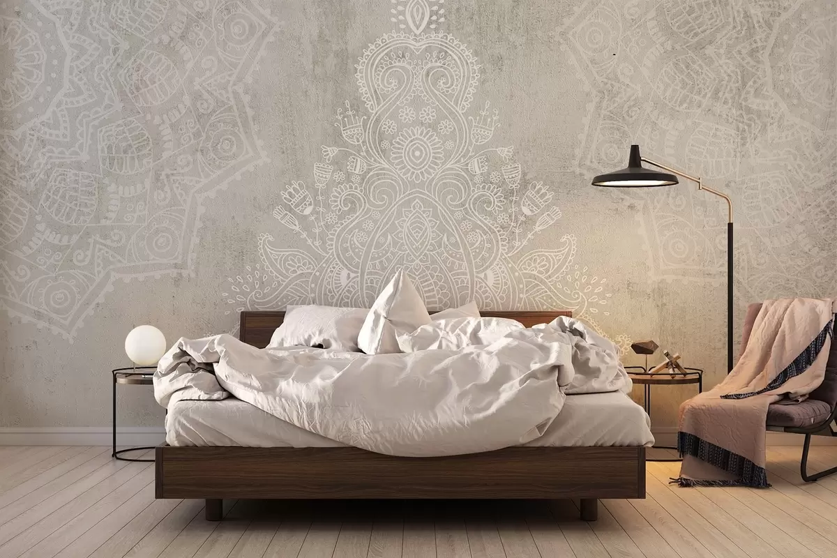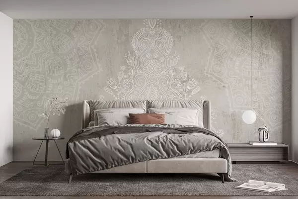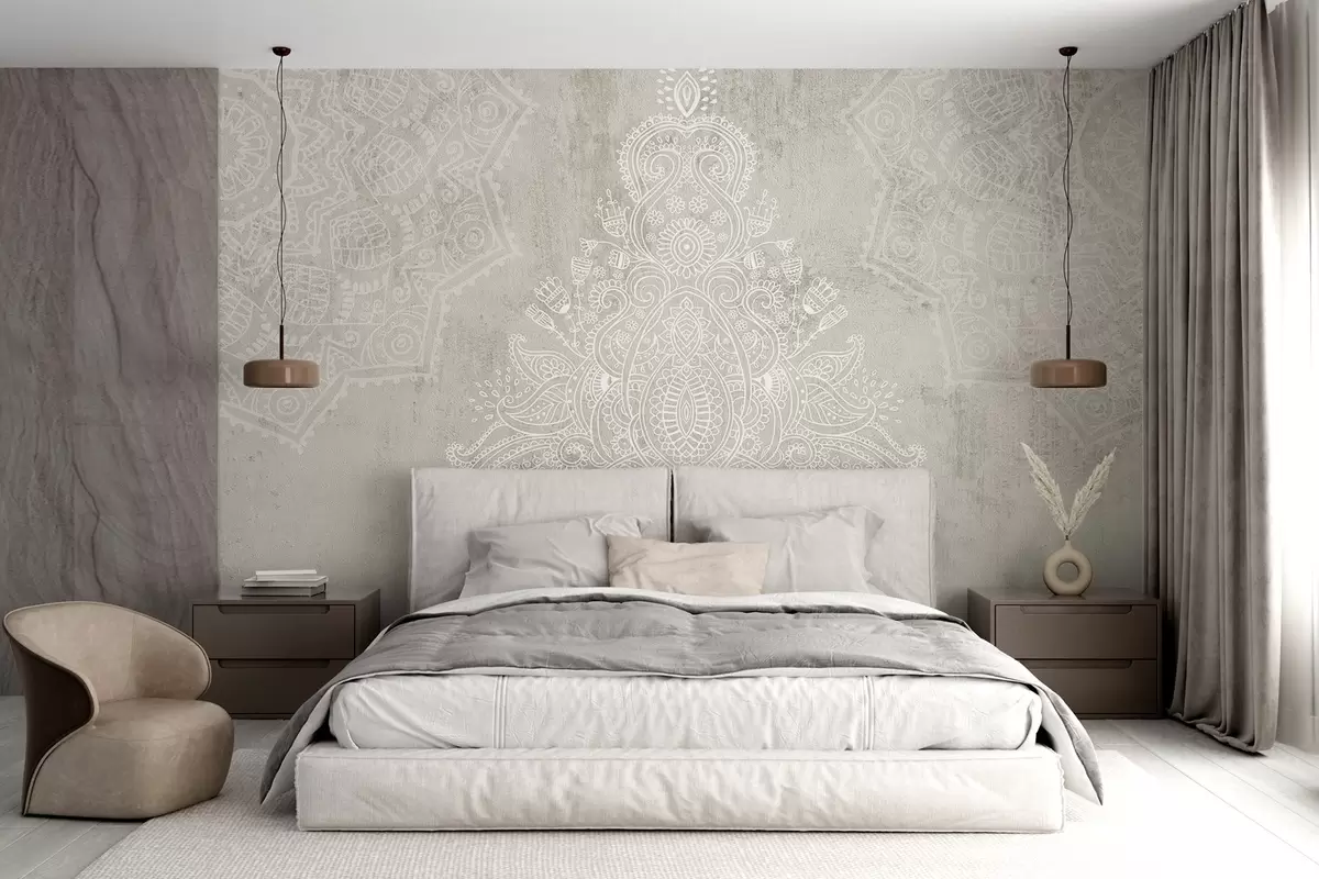 Fotomurales Un detallado e intrincado estampado de mandala de encaje blanco sobre un fondo abstracto de textura beige claro Nr. w08614