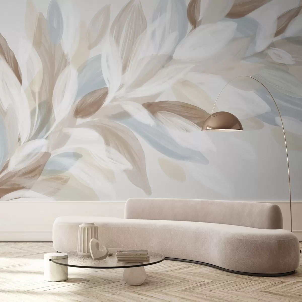 Fotomurales Suaves hojas de colores pastel en tonos blanco, beige y azul claro, que crean una composición delicada y etérea Nr. w08649
