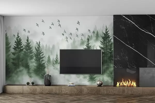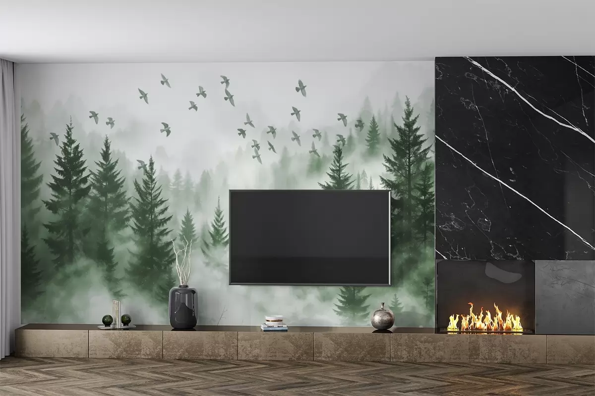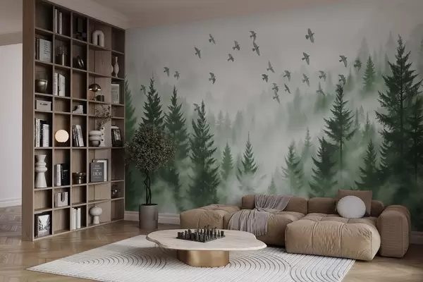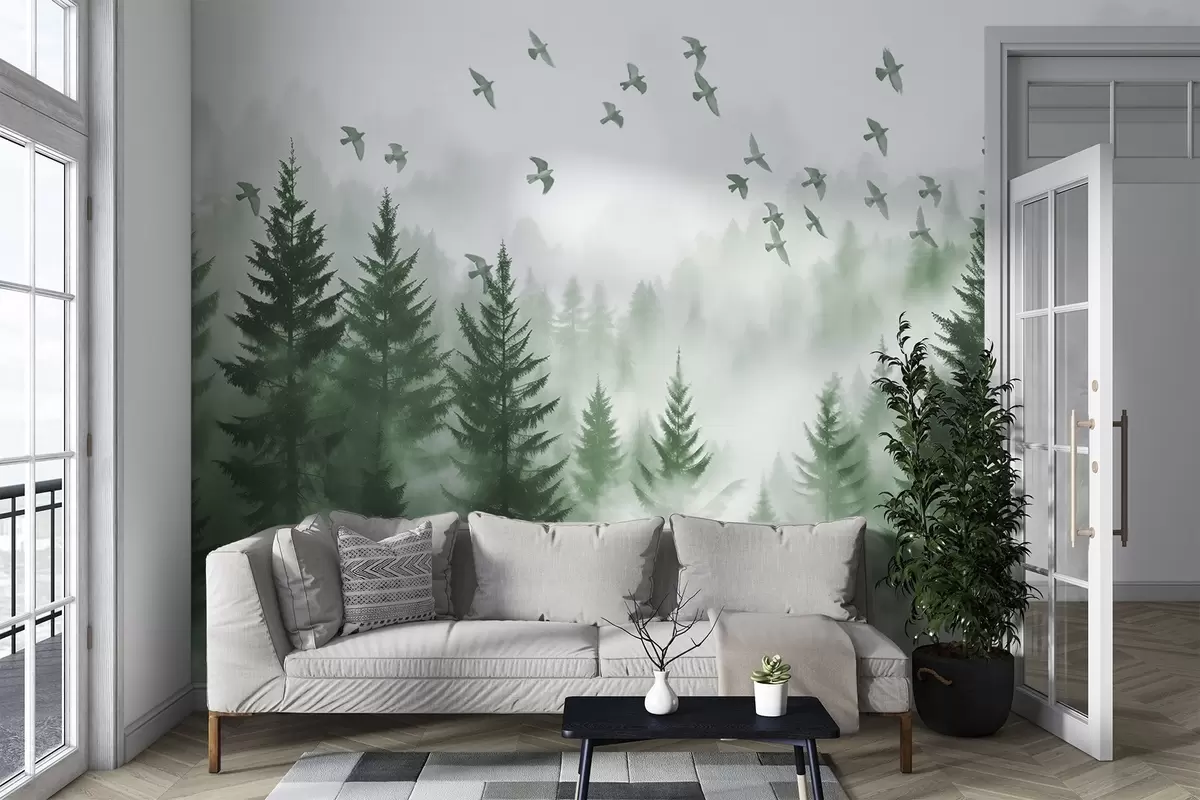 Fotomurales Tranquilo bosque de niebla con árboles en tonos verdes y bandadas de pájaros volando en el cielo Nr. w08664v1