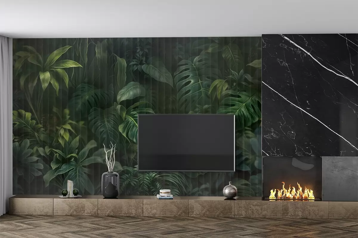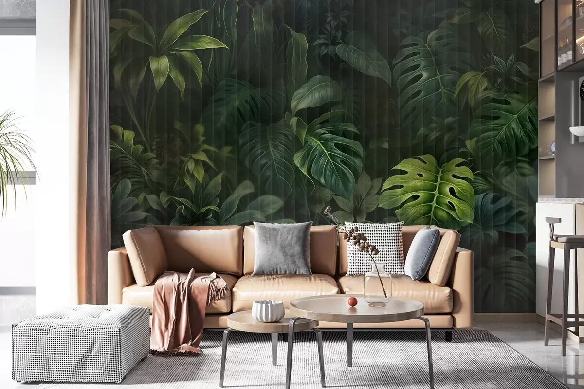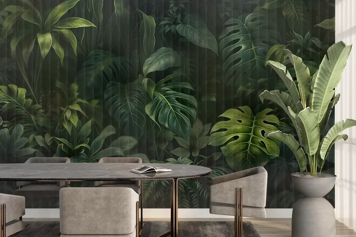 Fotomurales Estampado tropical oscuro difuminado y texturizado con varias hojas verdes, incluidas hojas de monstera y de palmera Nr. w08673