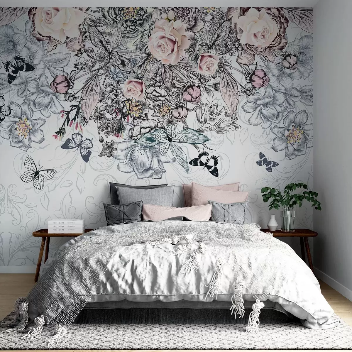 Fotomurales Un dibujo floral con rosas rosadas y varias flores y mariposas con intrincado arte lineal sobre fondo texturizado Nr. w08674