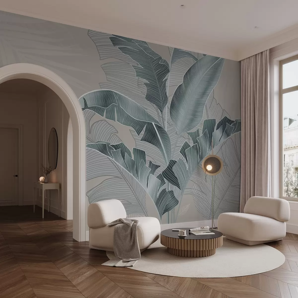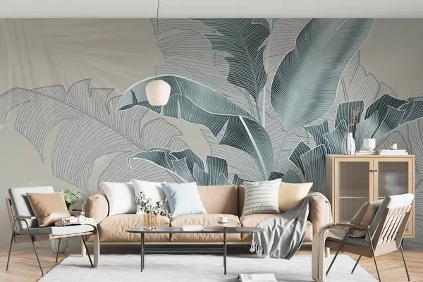 Fotomurales Una armoniosa composición de hojas tropicales en tonos beige y turquesa, con un detallado trabajo de líneas Nr. w08698v1