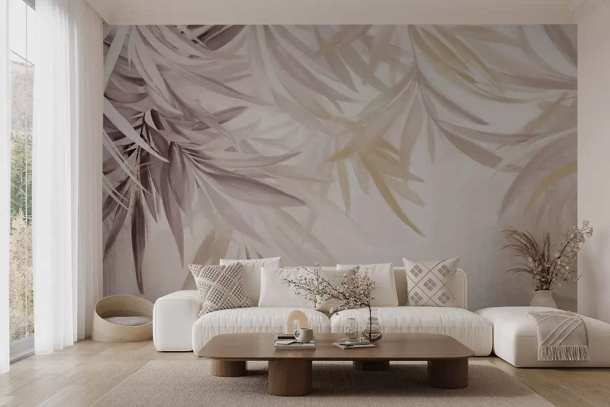 Fotomurales Suaves hojas tropicales de colores claros en tonos marrones y naranjas, que se funden en un estampado pálido y neutro Nr. w08703v1