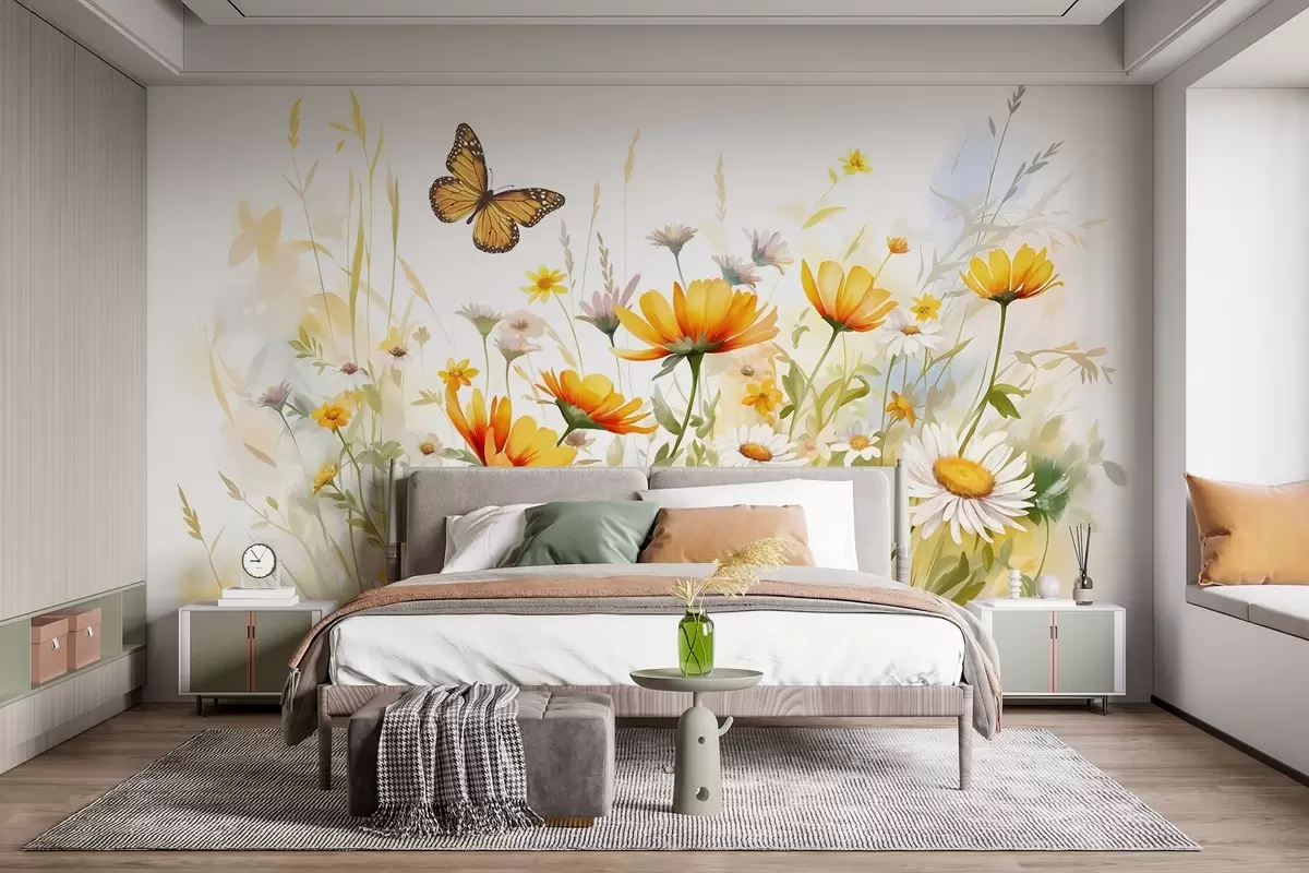 Fotomurales Un vibrante campo de flores en forma de acuarela con flores naranjas y amarillas y una mariposa sobre las flores Nr. w08739