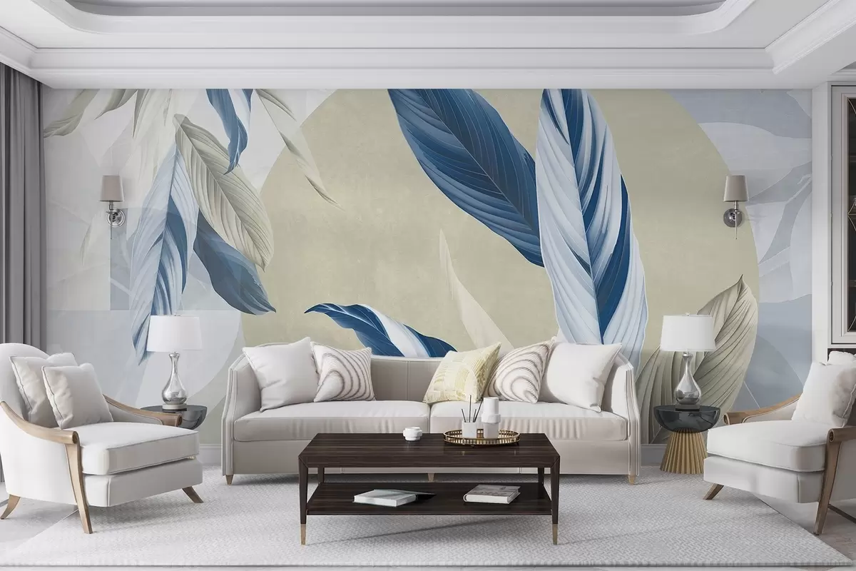 Fotomurales Composición geométrica texturada moderna y abstracta con hojas detalladas en tonos azul, beige y blanco Nr. w08741
