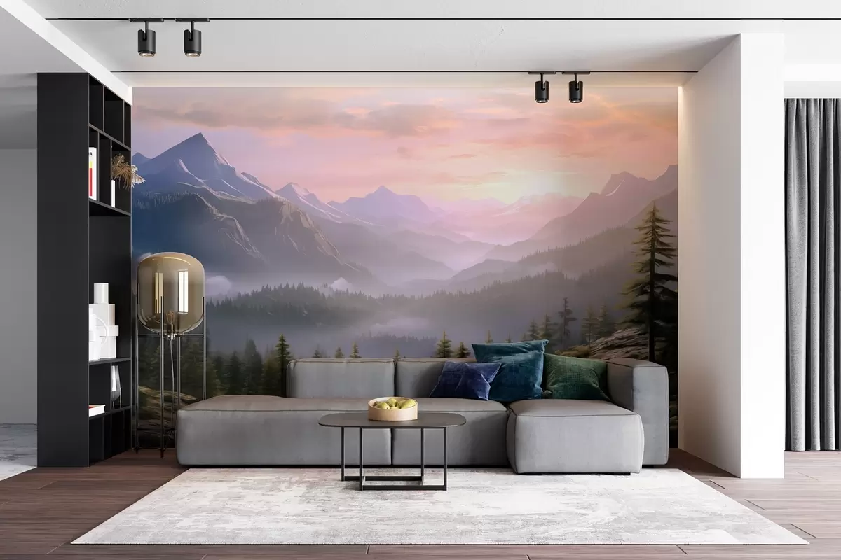 Fotomurales Sereno paisaje de montaña al amanecer con suave niebla sobre el fondo de un bosque Nr. w08750