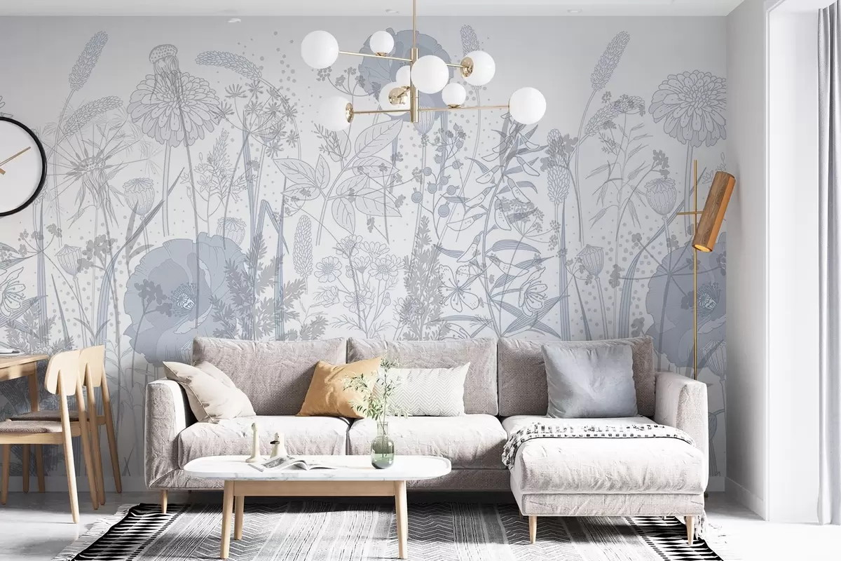 Fotomurales Campo de flores altas y hierba en tonos pastel azul claro sobre fondo blanco Nr. w08829