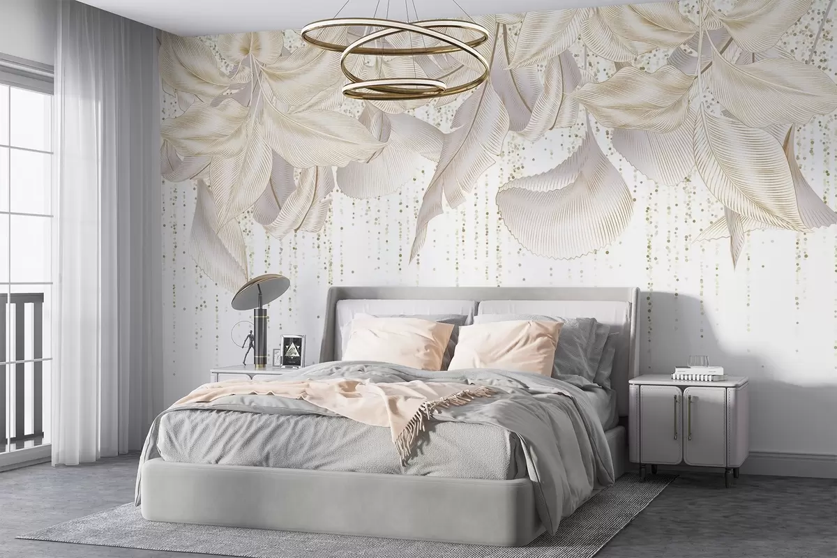 Fotomurales Textura de hojas tropicales detalladas en blanco y puntos amarillos sobre fondo blanco Nr. w08836
