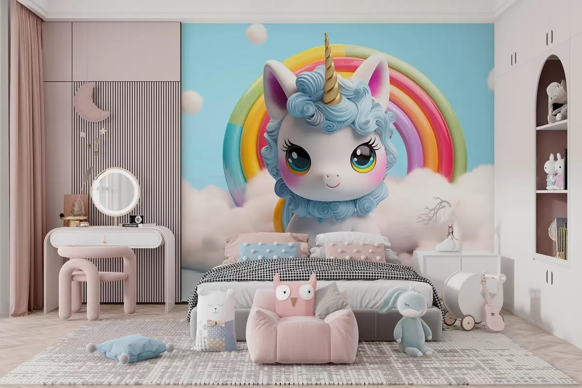 Fotomurales Un bonito unicornio en 3D rodeado de nubes y un arco iris Nr. w08848