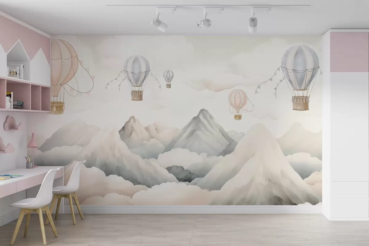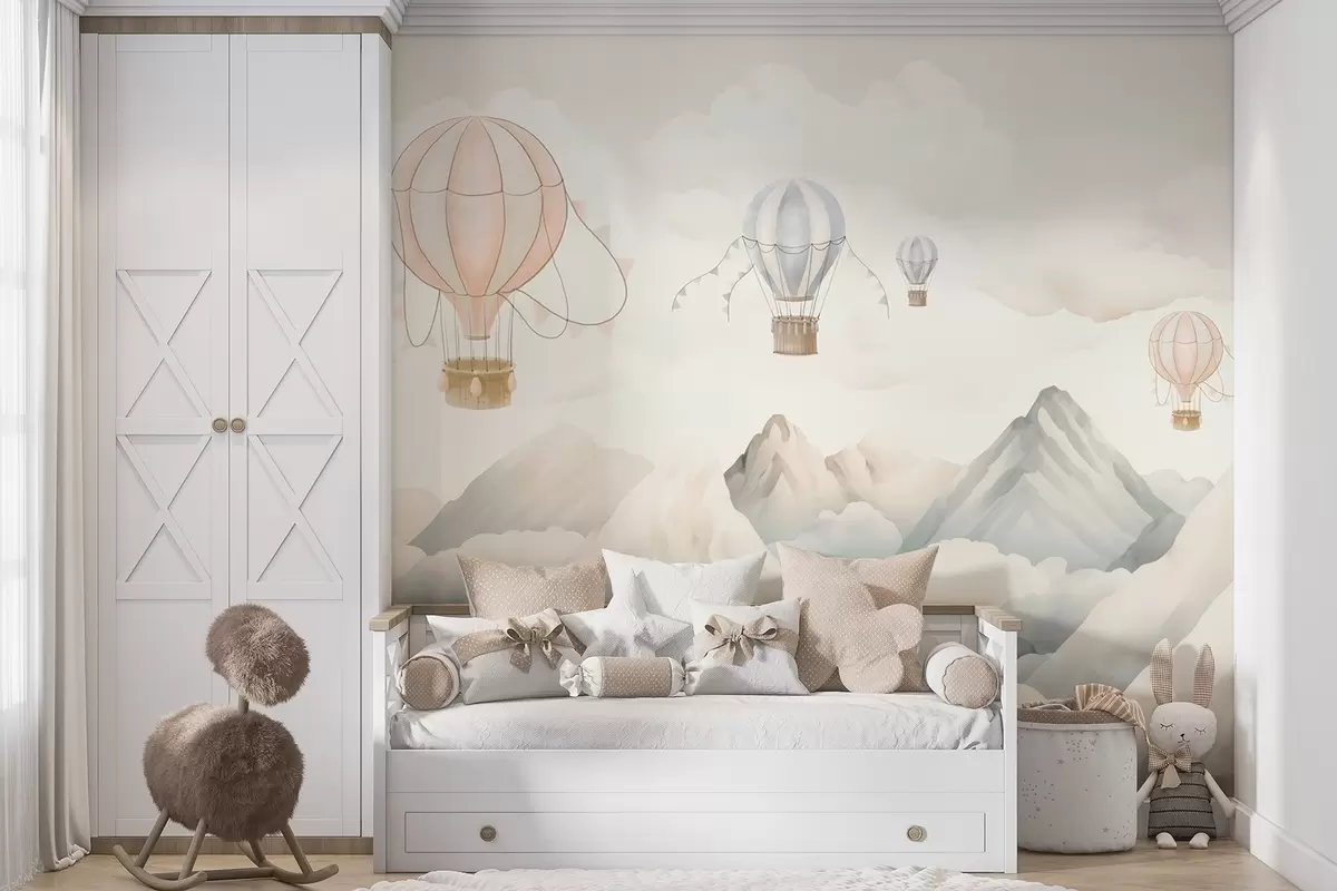 Fotomurales Globos aerostáticos flotando sobre las montañas en tonos pastel neutros y suaves Nr. w08853