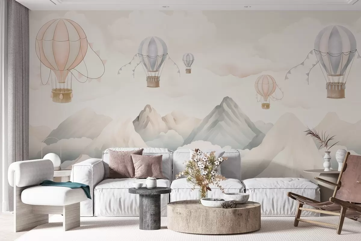 Fotomurales Globos aerostáticos flotando sobre las montañas en tonos pastel neutros y suaves Nr. w08853