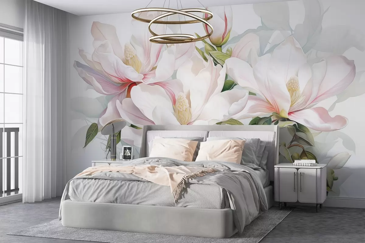 Fotomurales Flores de magnolia con pétalos blancos y rosas, hojas y ramas marrones, estilo acuarela suave y delicada Nr. w08885
