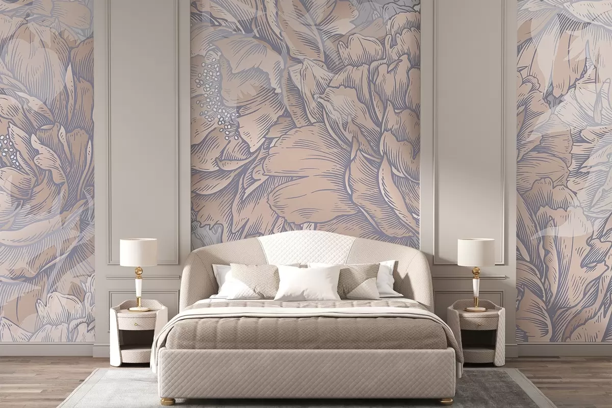 Fotomurales Flores de peonía con pétalos y estambres detallados, suaves colores pastel, estilo de ilustración botánica vintage Nr. w08890