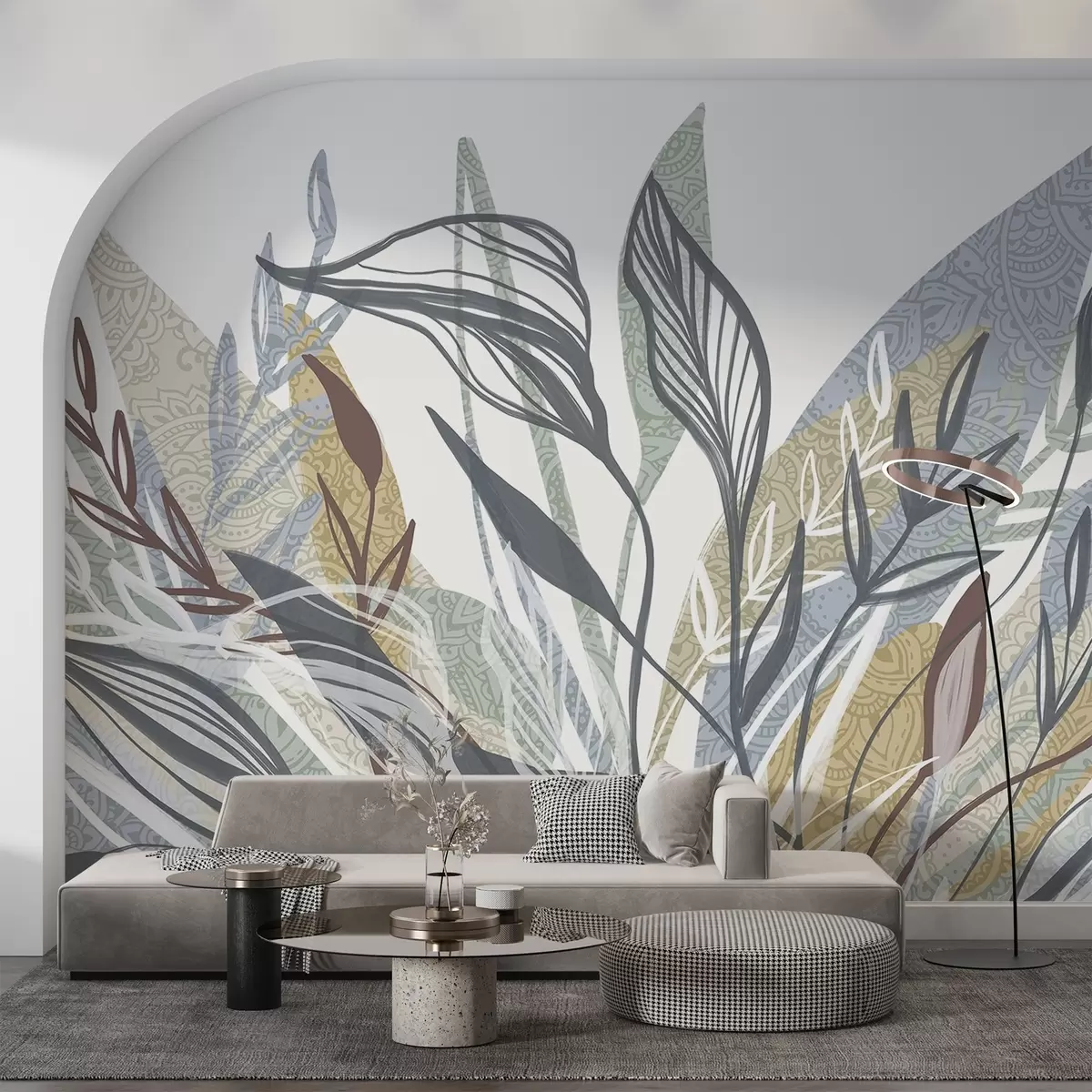 Fotomurales Una colección de hojas de diferentes colores y tamaños, algunas con arte lineal, sobre fondo blanco Nr. w08893