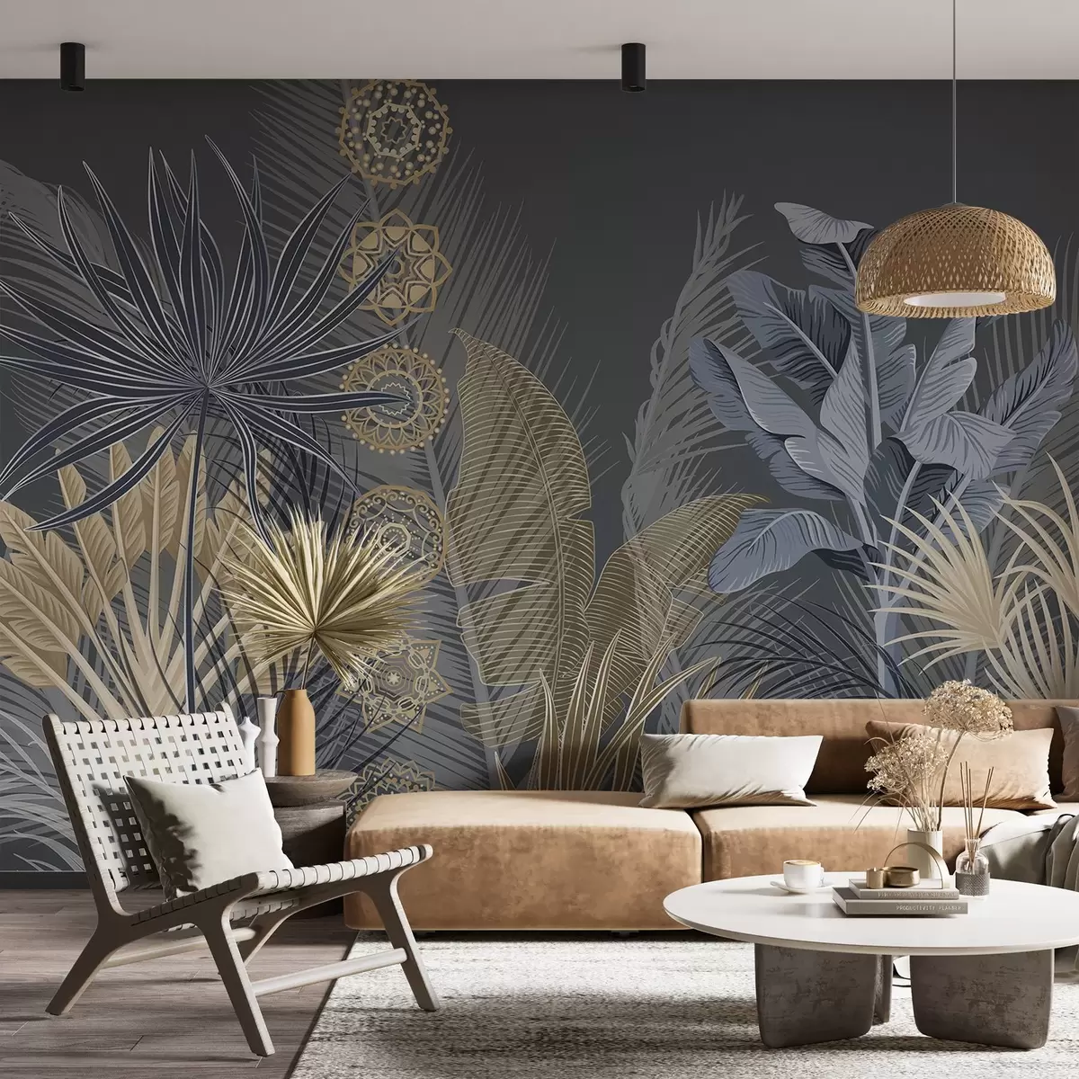 Fotomurales Hojas tropicales en tonos azules y marrones, hojas de palmera, hojas de plátano y adornos de mandala, fondo oscuro Nr. w08913