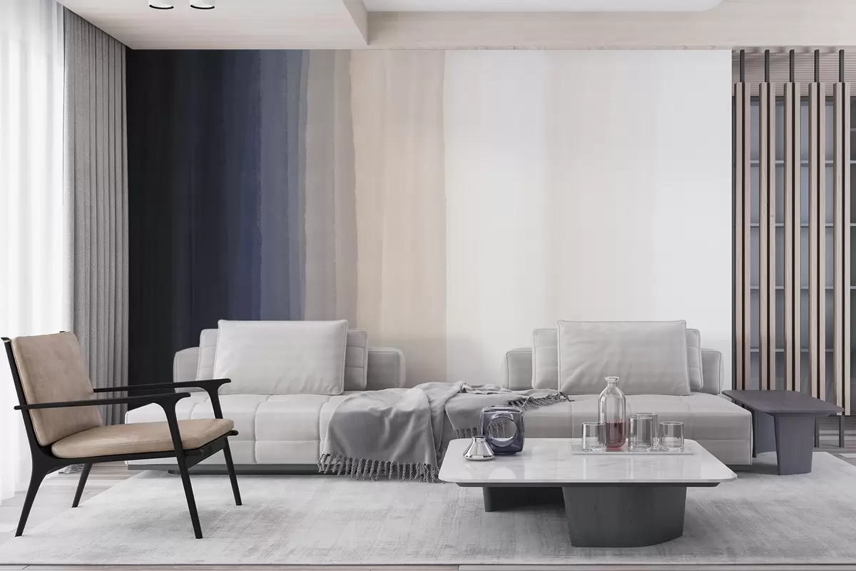 Fotomurales Estampado abstracto minimalista degradado con rayas verticales de azul oscuro, melocotón claro y blanco Nr. w08915v1