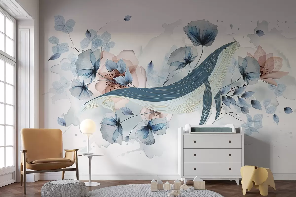 Fotomurales Una ballena azul con flores, estilo acuarela, colores azul claro y rosa, fondo claro Nr. w08922