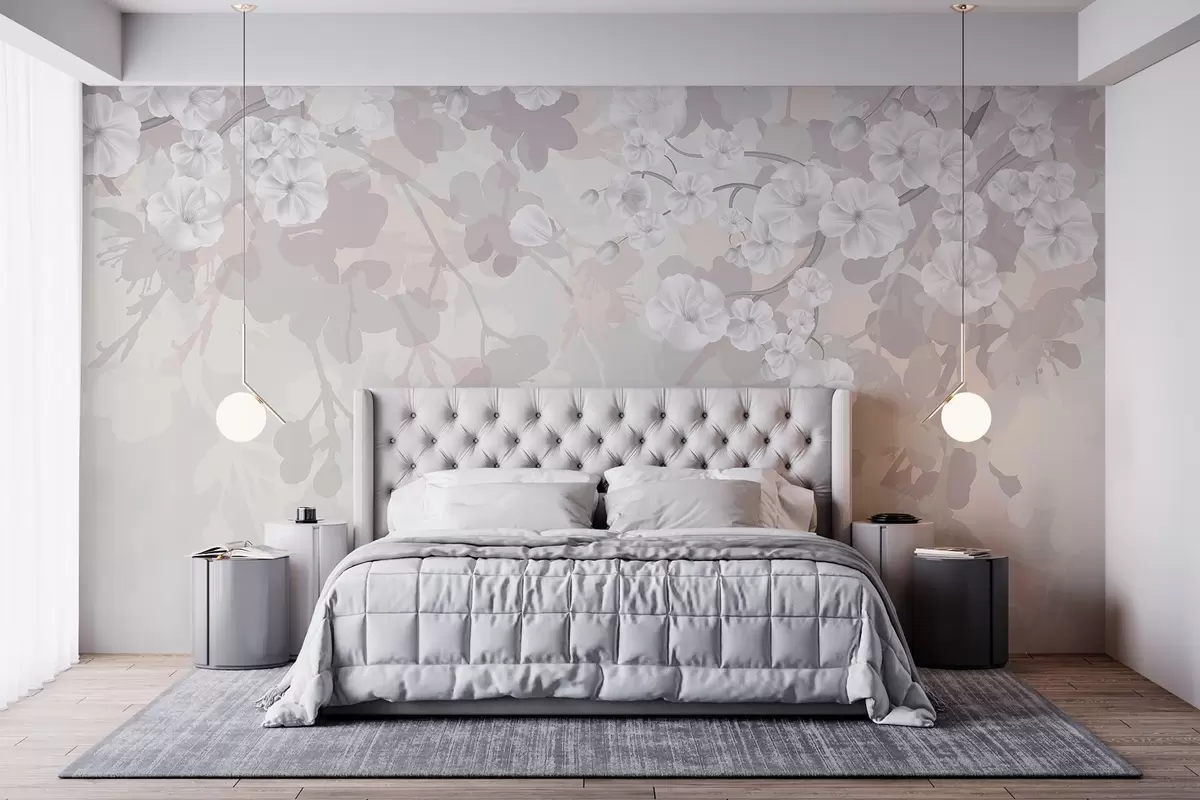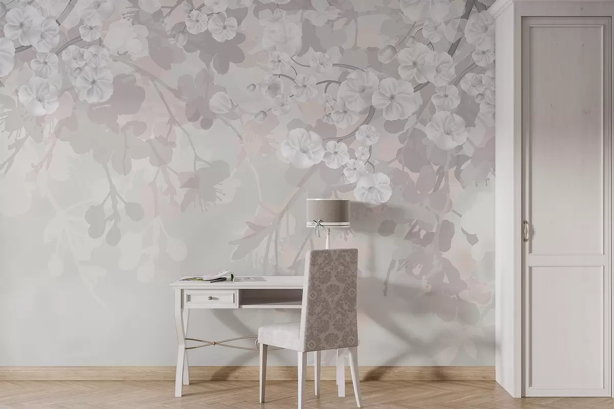 Fotomurales Ramas de cerezo en flor con flores blancas y hojas grises, sobre elegantes siluetas florales en suaves colores pastel Nr. w08973v1