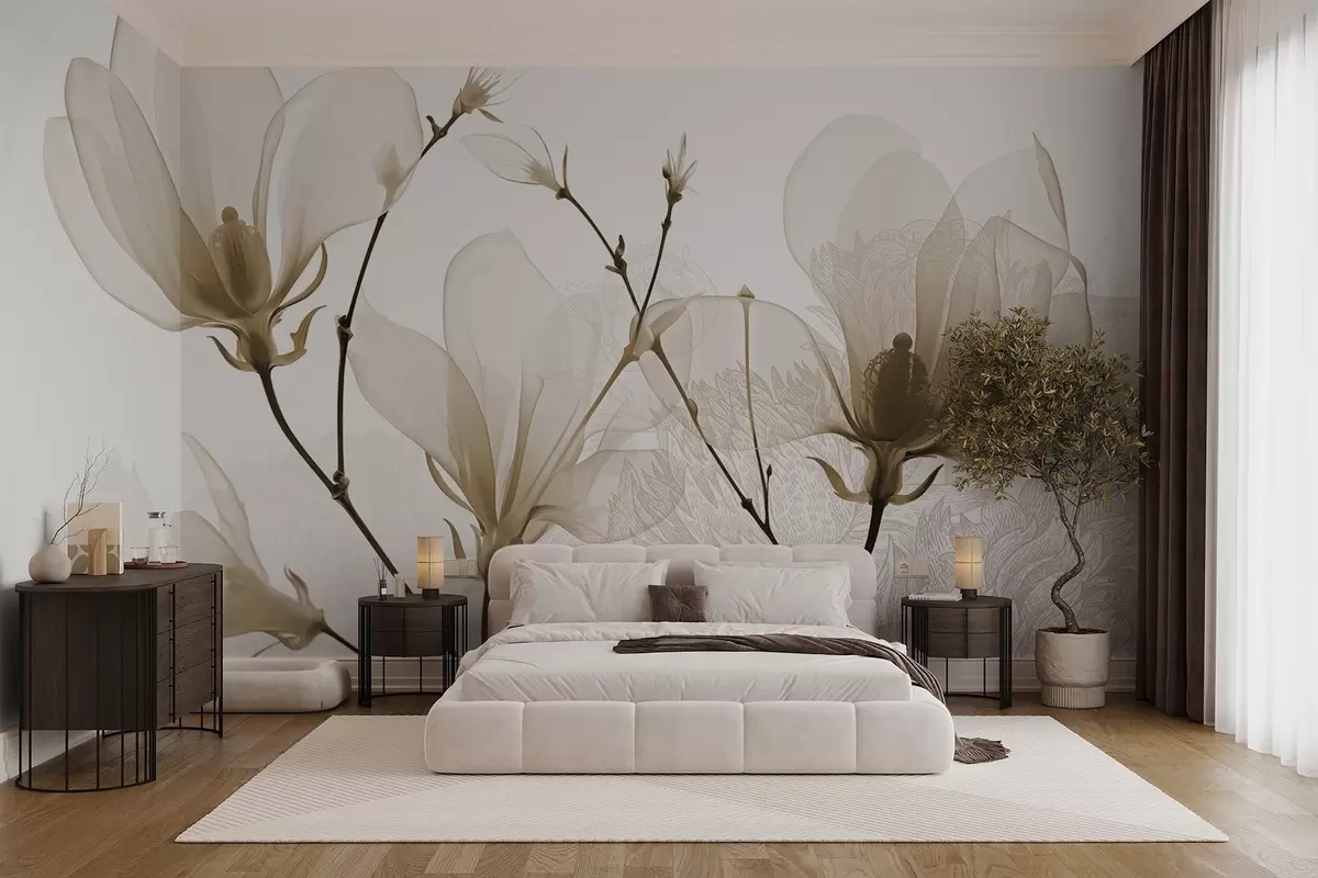 Fotomurales Flores de magnolia de color beige translúcido con siluetas de flores de delicados pétalos y tallos oscuros Nr. w08978v1