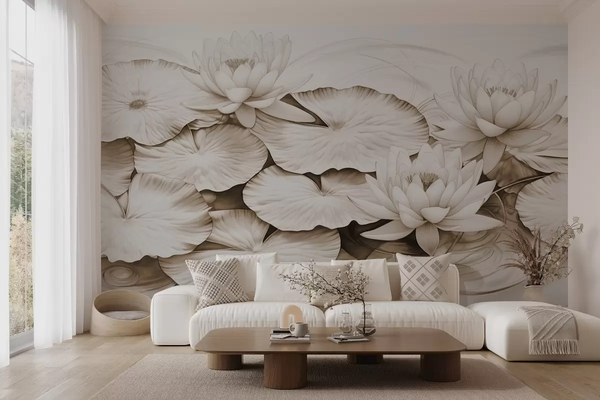 Fotomurales Nenúfares y nenúfares en un estanque, marrón y blanco imitación de dibujo a lápiz, ilustración botánica detallada, arte de la naturaleza Nr. w09006v2
