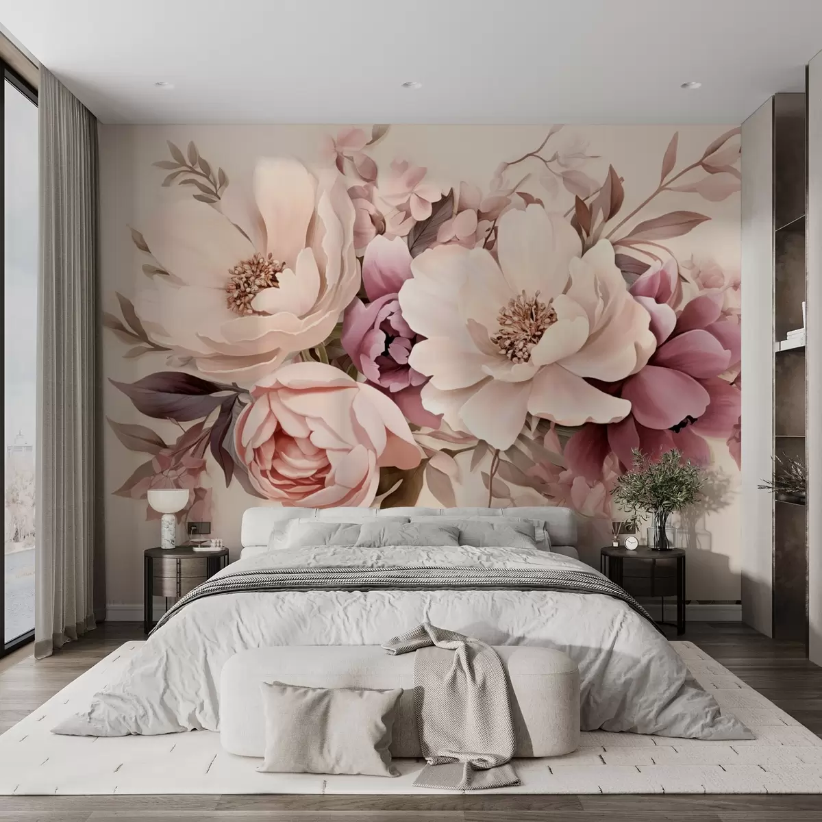 Fotomurales Delicada composición de flores rosas y beige, peonías con hojas Nr. w09019