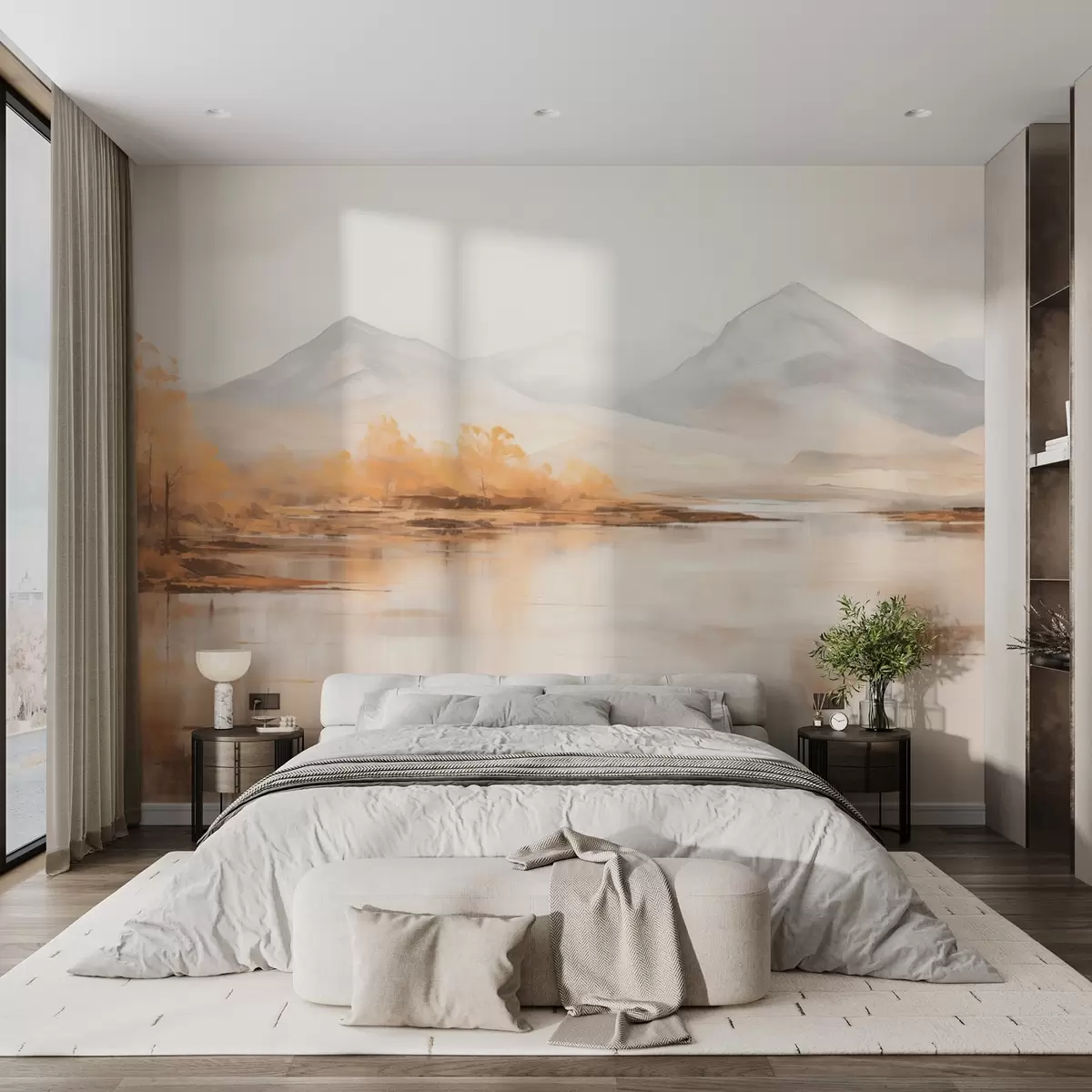 Fotomurales Paisaje otoñal con árboles amarillos y un río sobre un fondo montañoso Nr. w09020