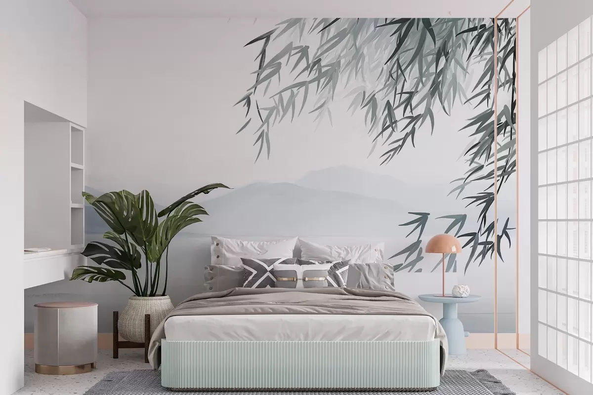 Fotomurales Hojas de bambú colgando sobre un lago con montañas al fondo, suaves tonos azules y blancos, estilo de pintura de lavado de tinta Nr. w09048