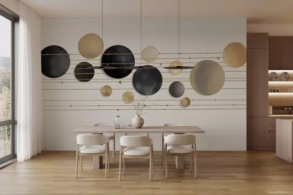 Fotomurales Diseño moderno abstracto con círculos texturizados en tonos blancos, amarillos y grises, conectados por líneas finas, arte minimalista Nr. w09060