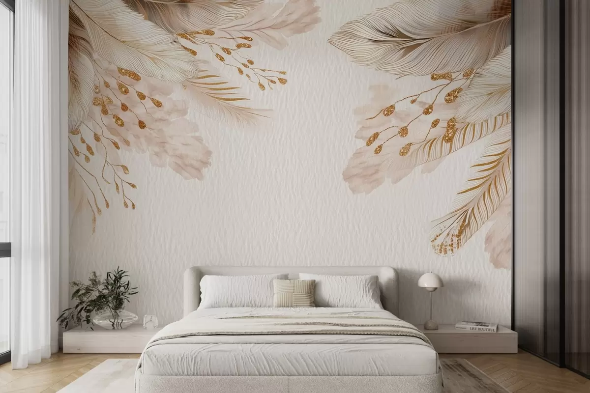 Fotomurales Hierba de las pampas y plumas en estilo acuarela en beige y blanco sobre papel Nr. w09079