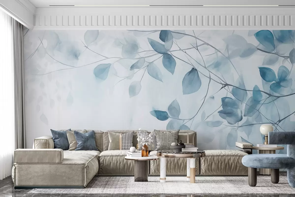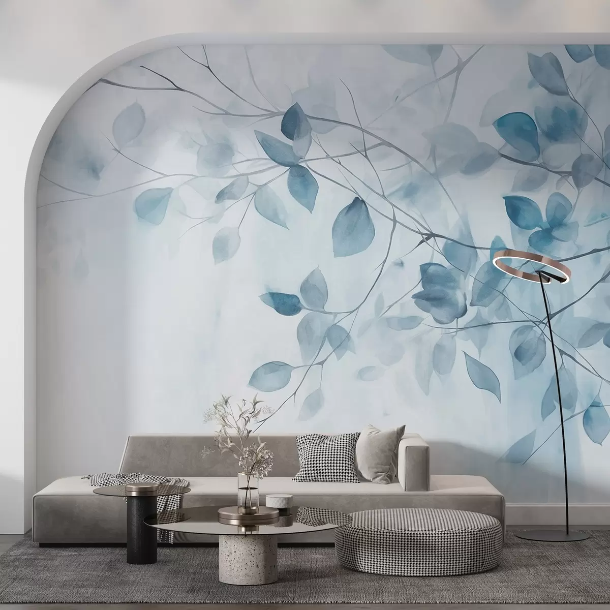 Fotomurales Pintura en acuarela con textura imitando hojas y ramas azules, colores suaves, detalles delicados sobre fondo blanco Nr. w09133v1