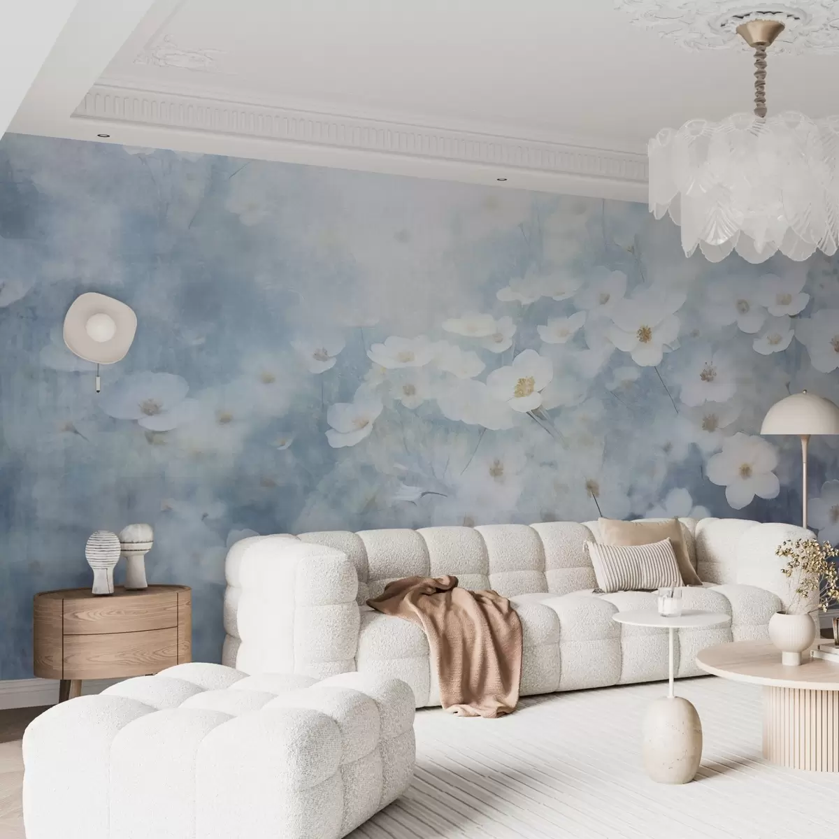 Fotomurales Campo texturizado de flores blancas de anémona, enfoque suave, atmósfera de ensueño, paleta de colores azul claro y blanco, prado primaveral Nr. w09134