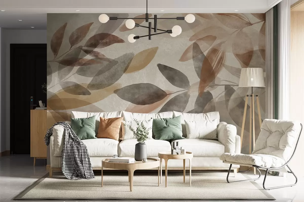 Fotomurales Hojas abstractas con textura en tonos marrones, beige y grises apagados, formas transparentes, estilo minimalista, formas orgánicas Nr. w09140