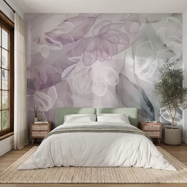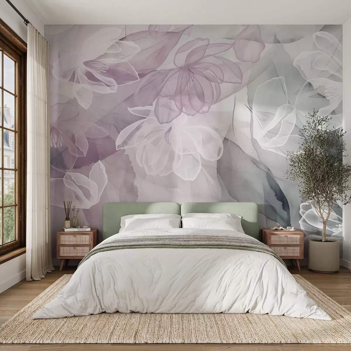 Fotomurales Flores y hojas con pétalos transparentes en tonos blancos, rosas y verdes, suaves y delicados Nr. w09158v1