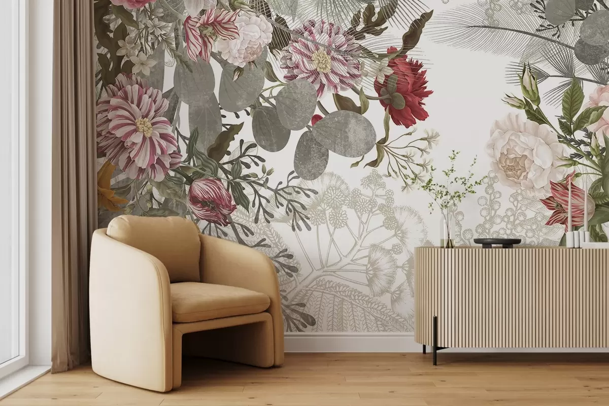Fotomurales Arreglo floral vintage con rosas, eucalipto y mimosa en tonos verde apagado, rojo y rosa Nr. w09164v1