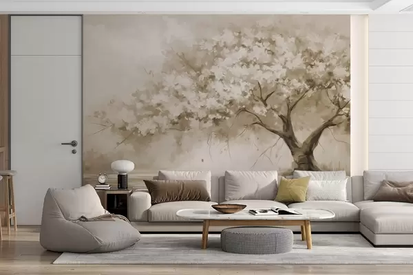 Fotomurales Árbol abstracto de flores beige en plena floración, junto a un río, pinceladas de textura suave y colores pastel Nr. w09193v1