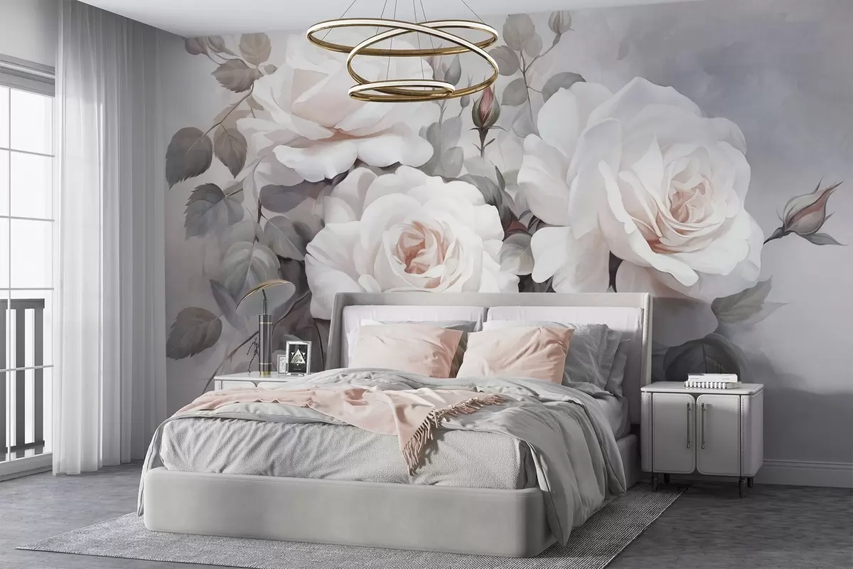 Fotomurales Rosas blancas texturizadas con hojas y tallos, suaves colores pastel apagados, elegante estilo vintage , delicadas pinceladas Nr. w09198