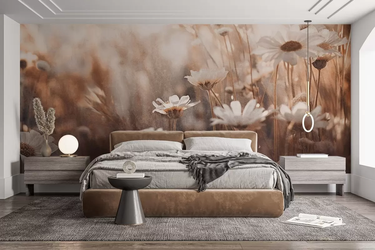 Fotomurales Campo texturizado de margaritas blancas y flores silvestres en paleta de colores cálidos con fondo difuminado Nr. w09214