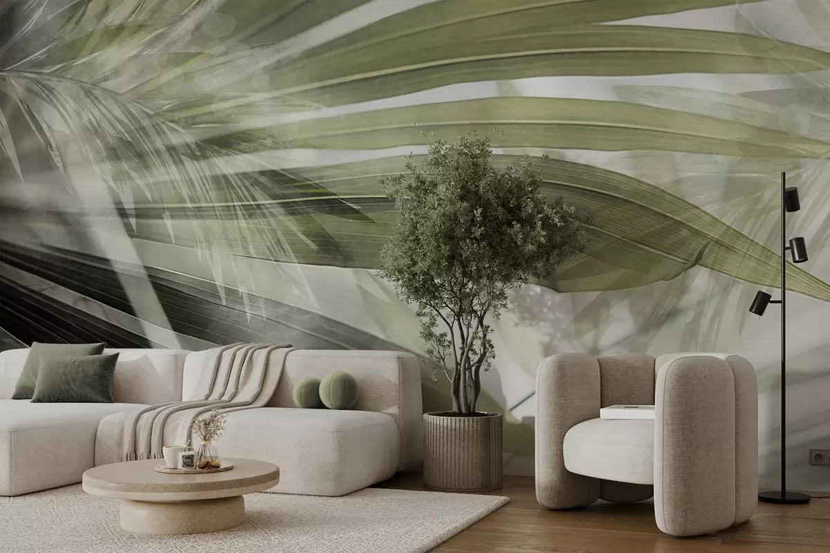Fotomurales Hojas de palmera de un tono verde claro, superpuestas y creando un efecto de capas, sobre un fondo suave y neutro Nr. w09256v1