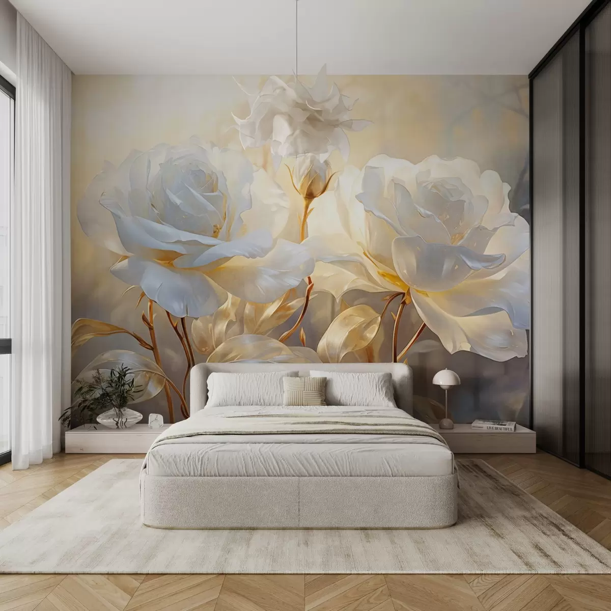 Fotomurales Rosas blancas texturizadas con tallos y hojas amarillas, iluminación suave, fondo claro con formas florales difuminadas Nr. w09258
