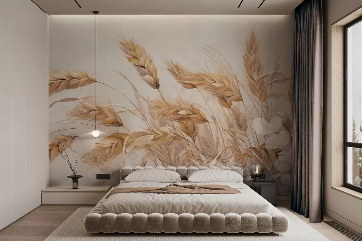 Fotomurales Campo con textura de trigo y espigas beige mecidas por el viento, colores suaves y apagados que crean una sensación de calidez Nr. w09264