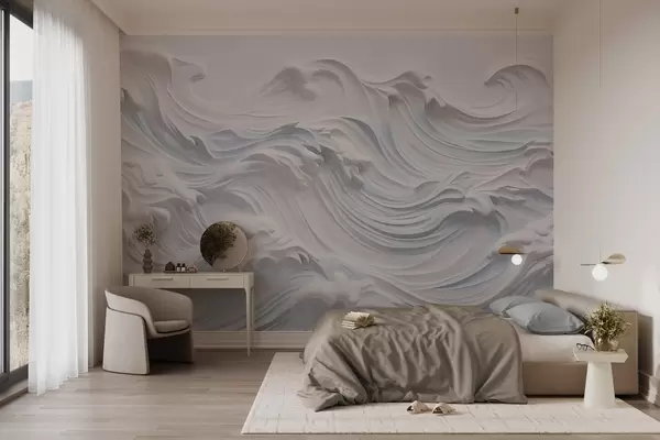Fotomurales Olas oceánicas abstractas de color blanco y azul claro con textura y espuma, que fluyen de izquierda a derecha, impresión dinámica y con textura Nr. w09266