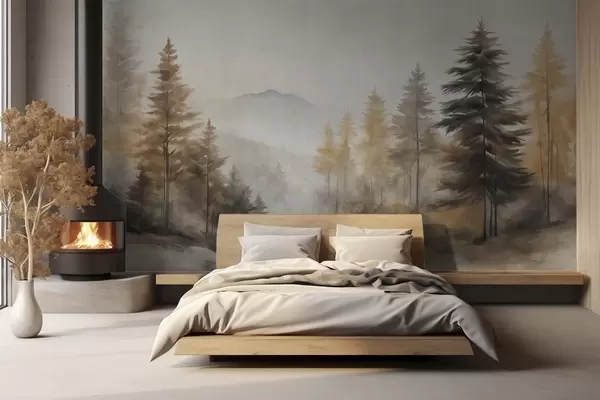 Fotomurales Bosque otoñal texturizado con altos pinos y montañas al fondo, los colores son apagados y terrosos estilo pintura Nr. w09290