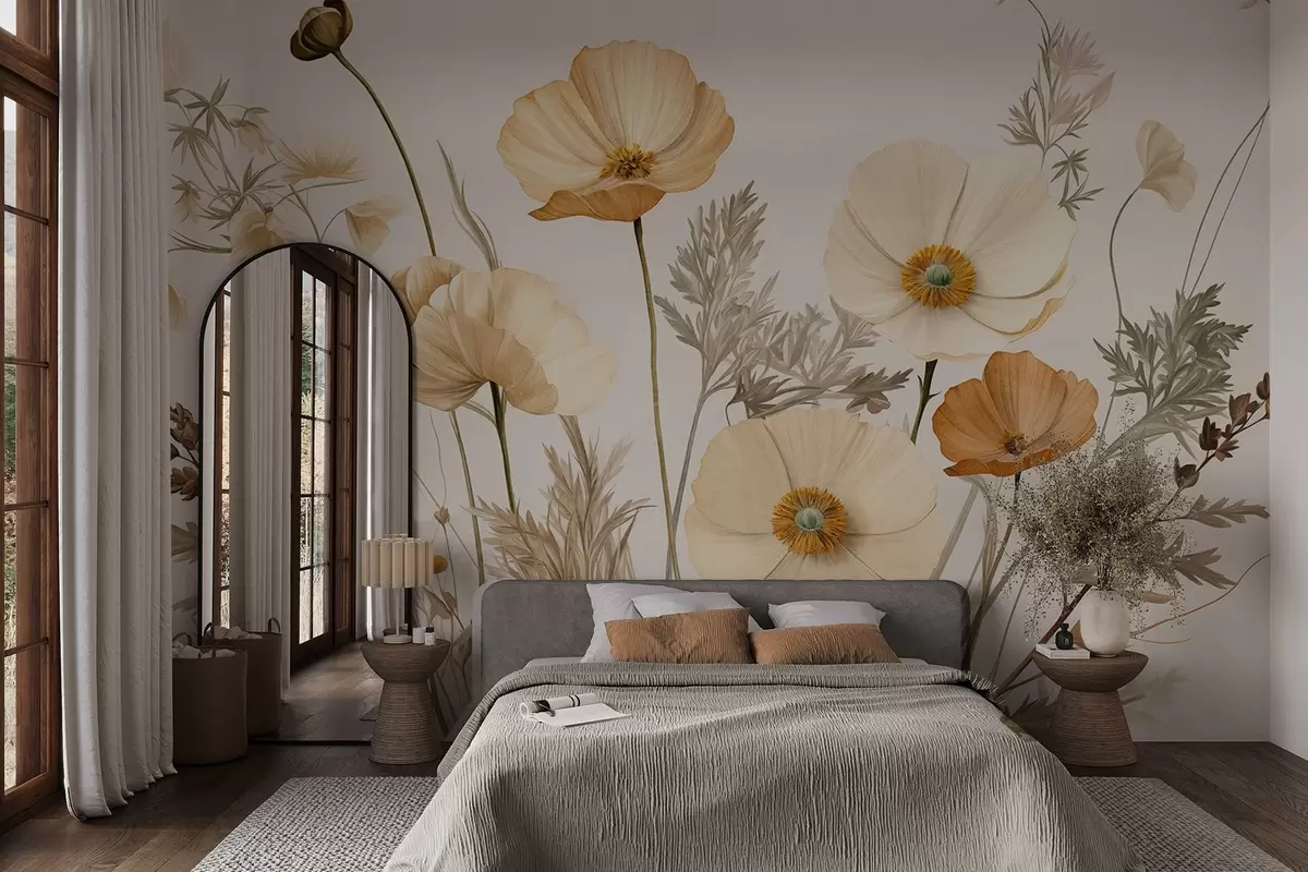 Fotomurales Amapolas naranjas y blancas de textura vintage con tallos y hojas finas, fondo beige claro, estilo acuarela Nr. w09293