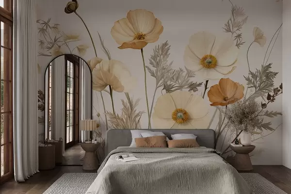 Fotomurales Amapolas naranjas y blancas de textura vintage con tallos y hojas finas, fondo beige claro, estilo acuarela Nr. w09293
