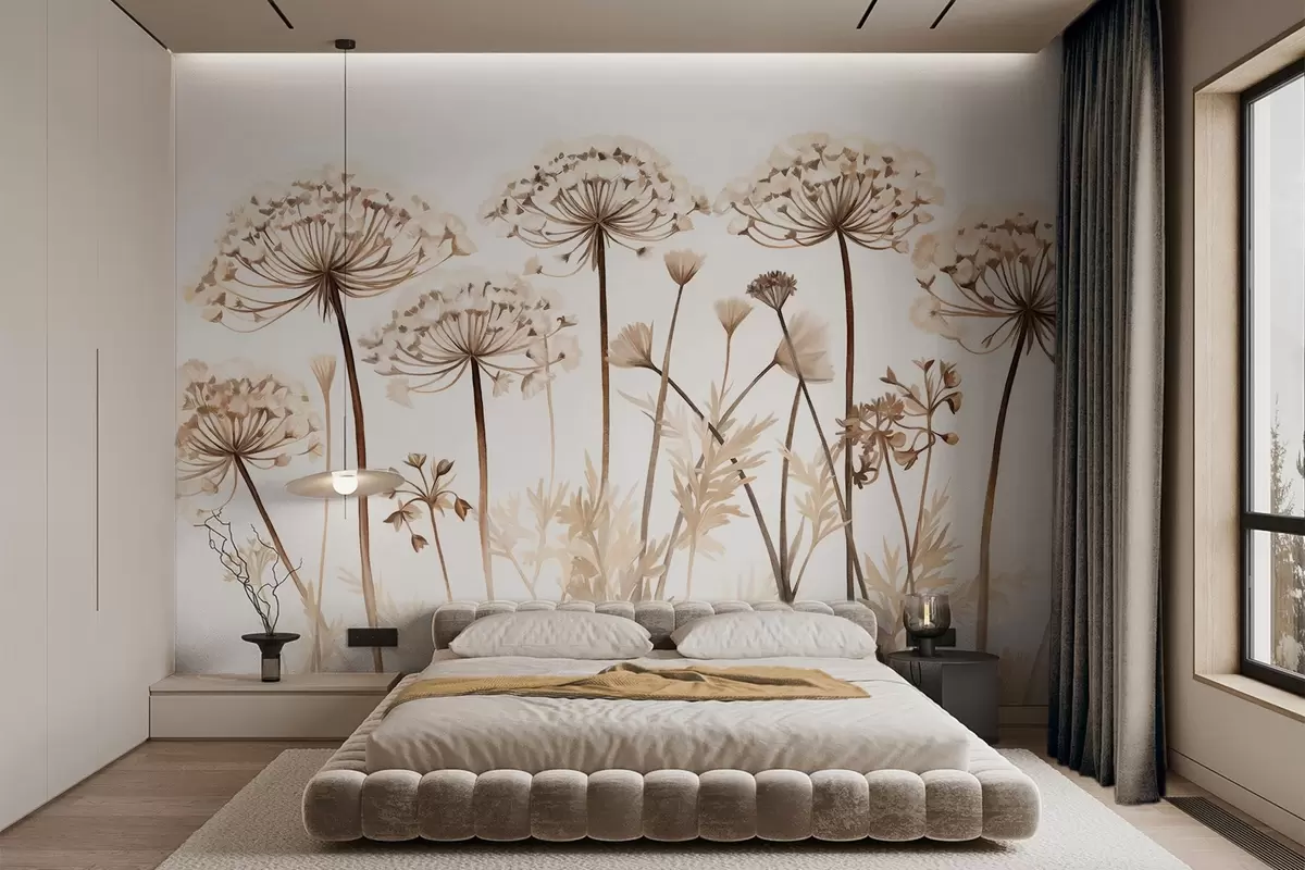 Fotomurales Flores de Queen Anne's Lace en un campo, imitación de pintura texturizada, paleta de colores marrón, beige y blanco, ilustración botánica Nr. w09294