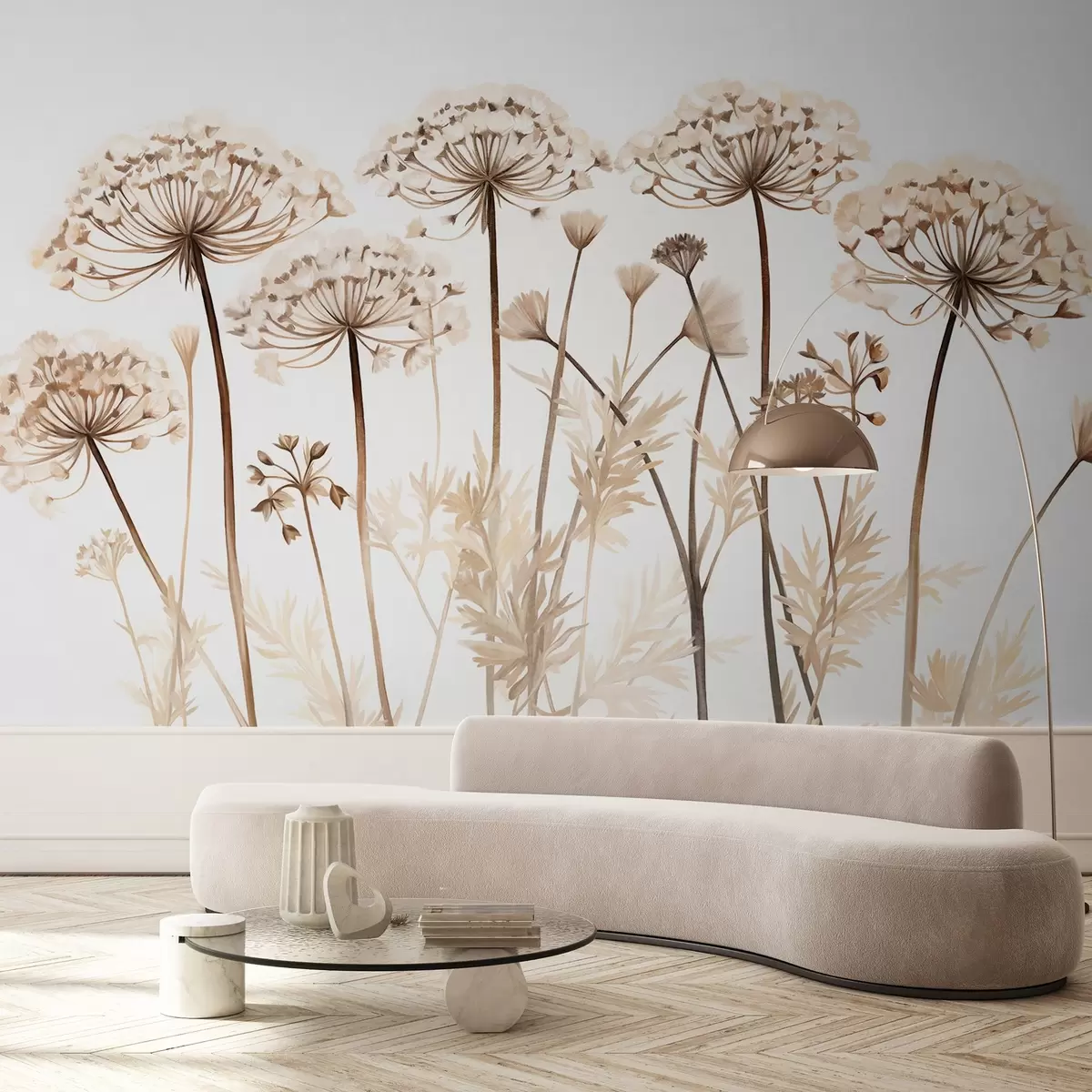Fotomurales Flores de Queen Anne's Lace en un campo, imitación de pintura texturizada, paleta de colores marrón, beige y blanco, ilustración botánica Nr. w09294