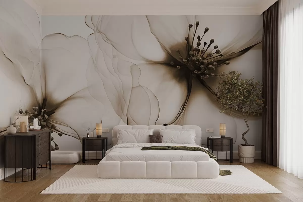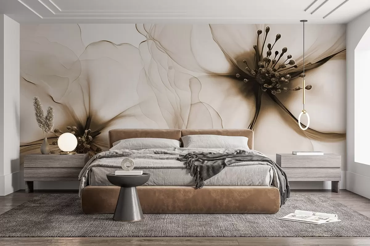 Fotomurales Dos flores marrones de textura translúcida con estambres visibles, pétalos delicados superpuestos y una textura suave y fluida Nr. w09295
