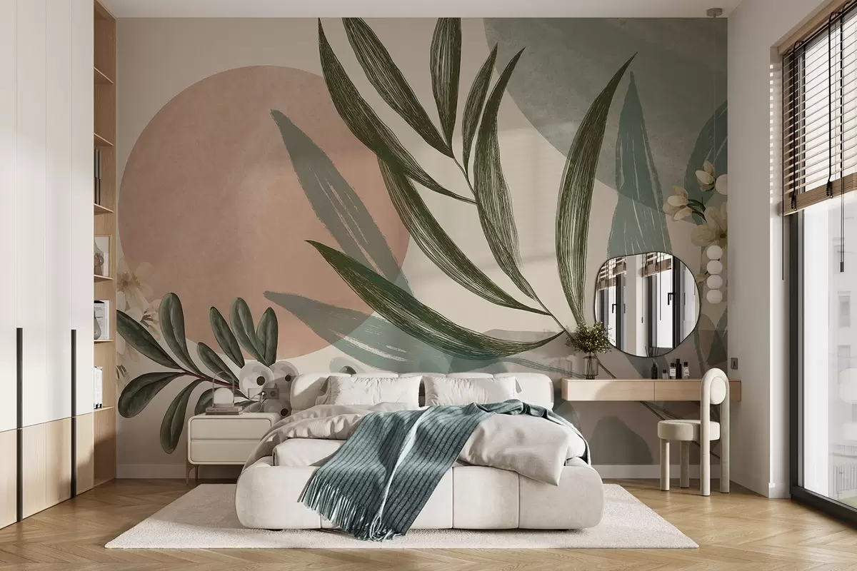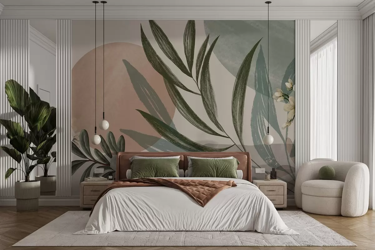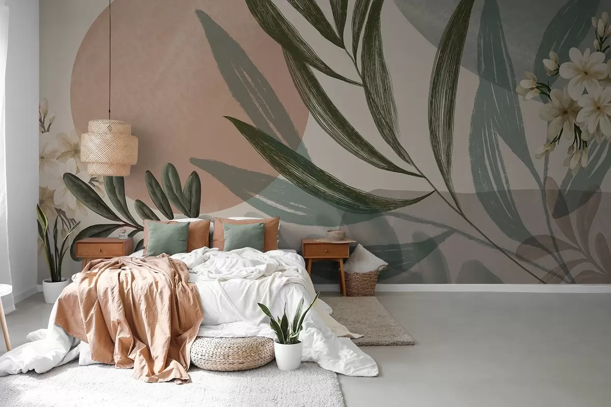 Fotomurales Arte botánico abstracto con hojas de palmera verdes y bayas blancas, sobre un fondo de formas en tonos tierra apagados Nr. w09312