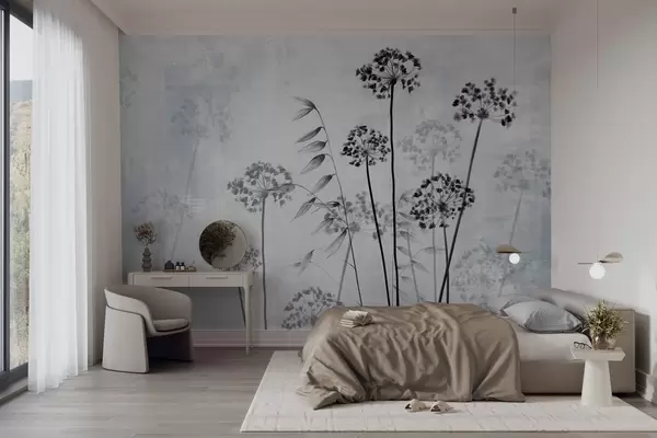 Fotomurales Dibujo de flores secas con tallos largos, paleta monocroma, sobre fondo gris claro texturado, ilustración botánica Nr. w09314